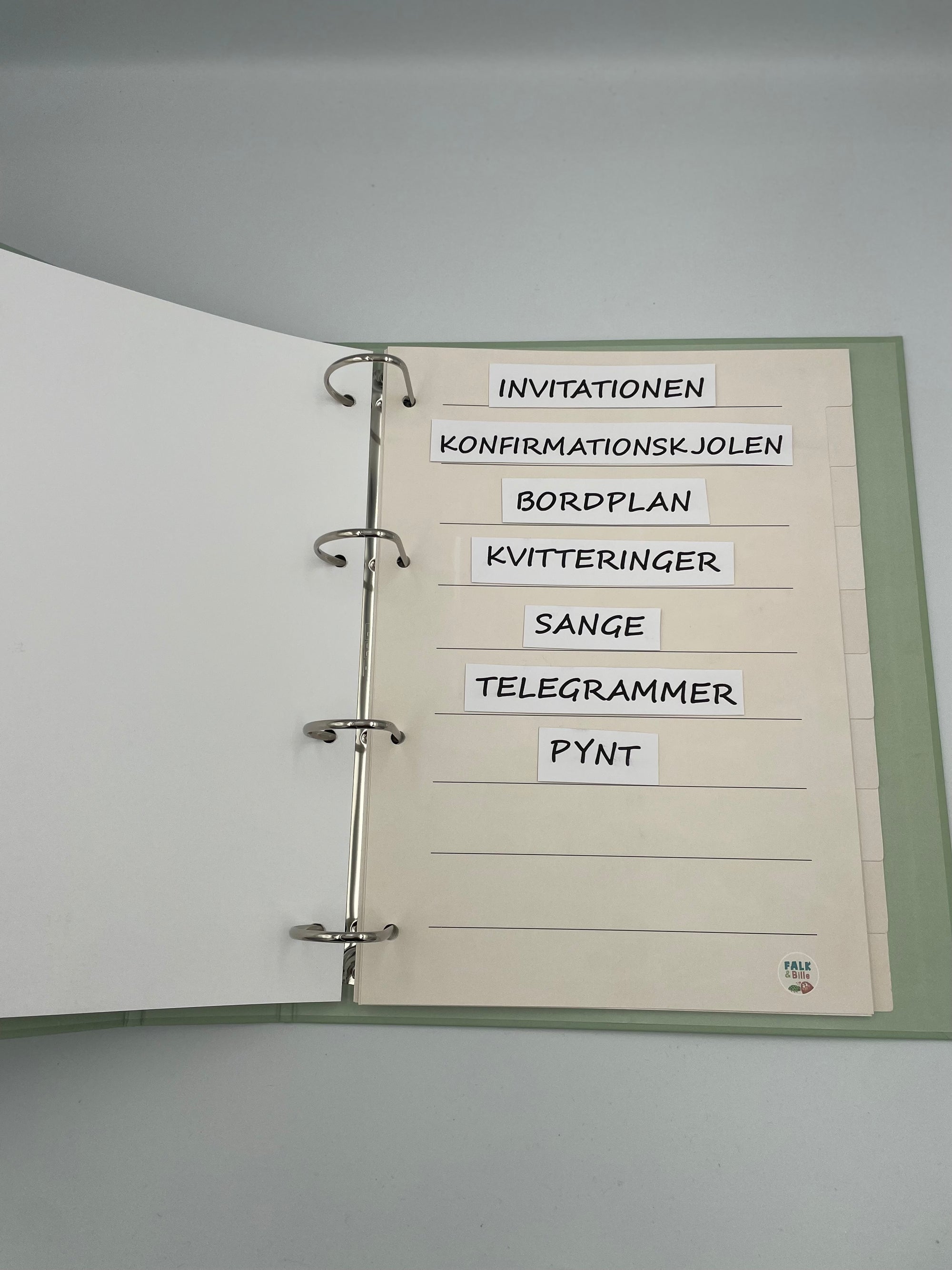 Individuelt Tilpasset: Inkluderet i ringbindet er tomme faneark, så konfirmanden selv kan vælge, hvad der skal gemmes. Fra personlige noter til billeder – dette ringbind giver fuld frihed til at skabe en personlig erindringsbog.