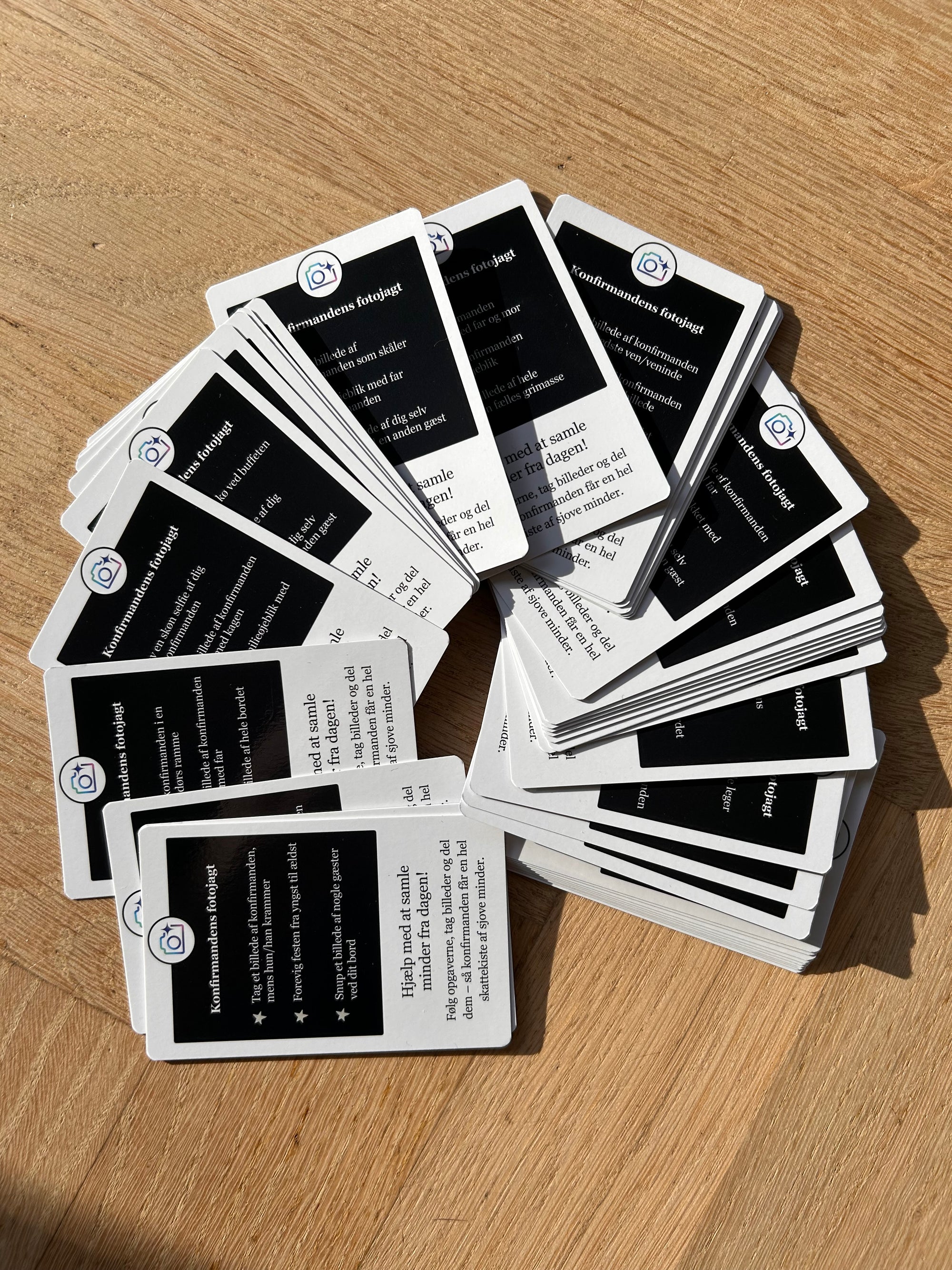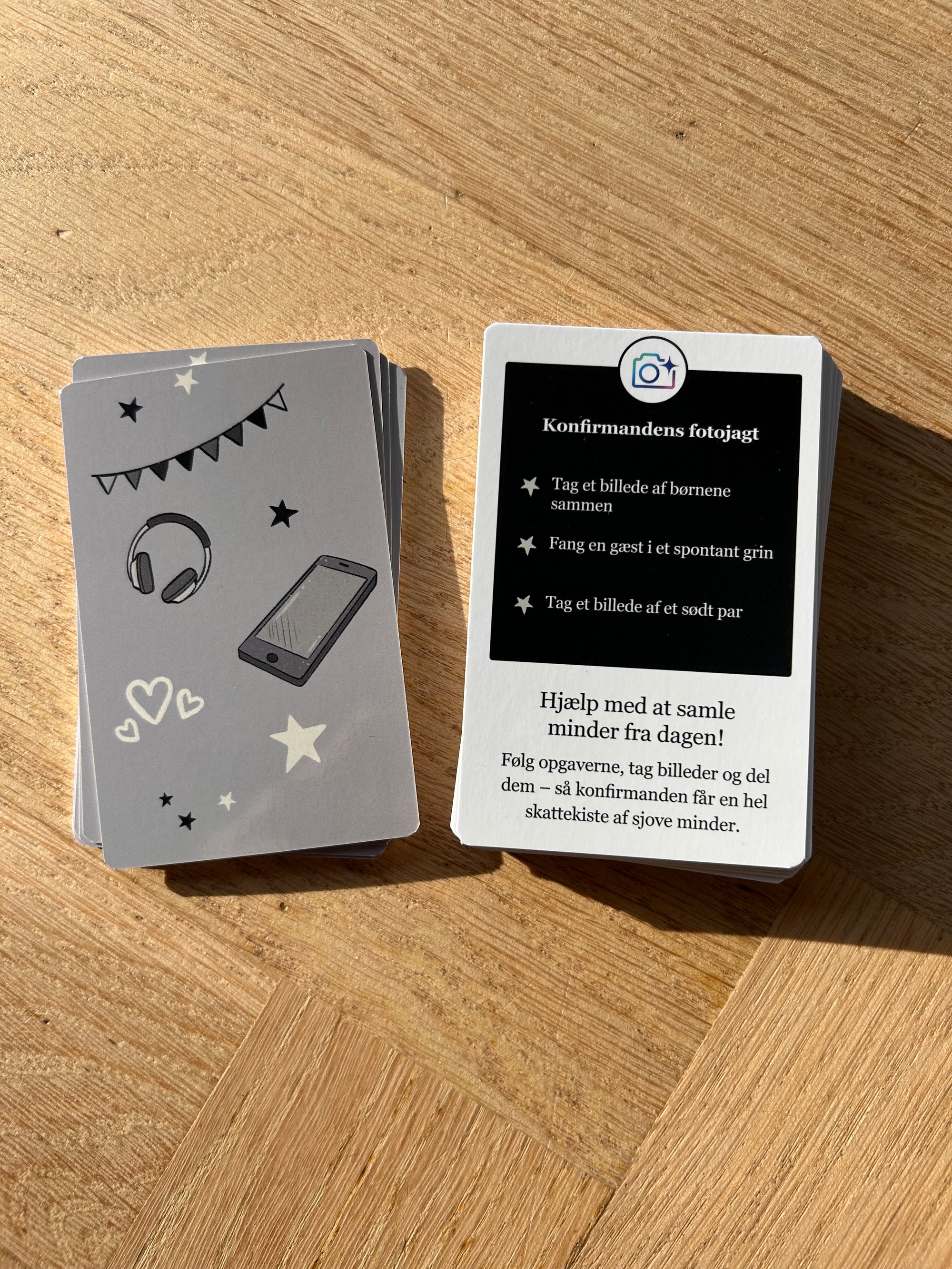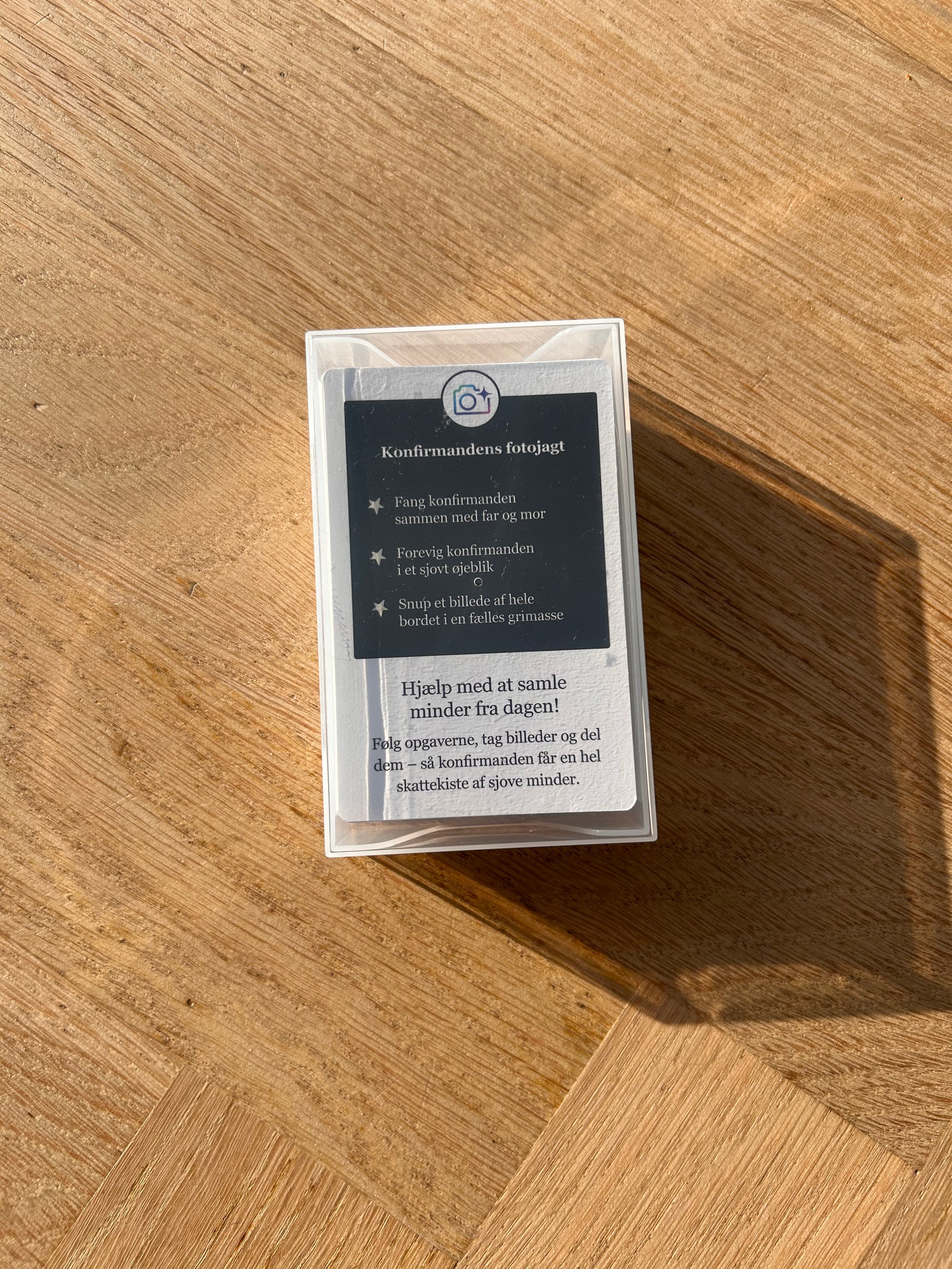Sættet indeholder 56 festlige kort fyldt med sjove, og kreative fotoopgaver, der får både familie og venner til at tage billeder, grine og skabe uforglemmelige minder sammen med konfirmanden.